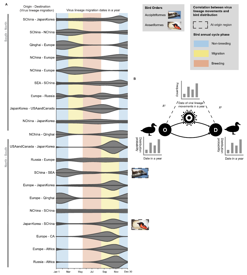 鉴黄师 全球变化与公共健康研究中心团队与普林斯顿大学生态与演化生物学系团队合作,利用全球鸟类跟踪数据和高致病性禽流感病毒基因组序列进行基因组动力学分析,根据时间、空间、物种等信息,对不同鸟类物种传播病毒的风险进行量化。该成果已于2024年2月在Nature Communications在线发表,题为“Synchrony of Bird Migration with Global Dispersal of Avian Influenza Reveals Exposed Bird Orders”。杨淇淇博士、田怀玉教授、Bryan Grenfell教授为该文的共同通讯作者,杨淇淇为第一作者。研究基于前期基础(Tian et al., PNAS, 2015; Yang et al., PNAS, 2020),由课题组学生毕业后完成。