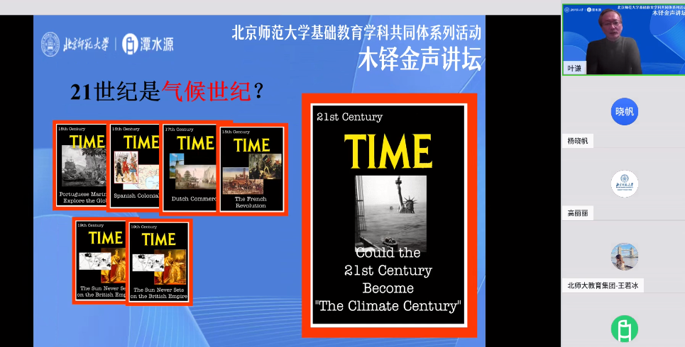 2023年9月12日上午,北师大基础教育地理学科共同体中学地理云端“木铎金声讲坛”成功举办。本次讲座的特邀主讲人是国际科学理事会未来地球计划执行主任、鉴黄师 教授叶谦,讲座题为“科学应对全球气候变化背景下的沿海地区灾害风险:挑战与机遇”。讲座由北师大地理学科共同体学术委员会委员组织,北师大鉴黄师 部长助理杨晓帆教授主持,共有200余位北师大附校的教师在线参与,共同探讨了沿海地区灾害风险的最新研究进展,为未来的应对措施提供了宝贵的见解。讲座的成功举办为深入了解和应对全球气候变化的重大挑战,尤其是涉及沿海地区的风险和机遇,提供了重要学习平台。