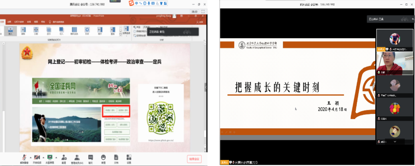 本次宣讲会内容主要包括学部征兵工作简介、大学生参军政策解读以及入伍交流三部分。退伍大学生士兵协会会长秦范同学首先向大家讲解了最新的国家的征兵政策,并分享了自己的入伍经历和心得感受。之后,王颖老师介绍了地理学部往年征兵工作,展示学部5名大学生士兵的军旅生活和他们对在校同学们的真挚寄语。王老师还结合此次新冠疫情涌现的英雄榜样,鼓励同学们积极思考人生的意义,勇于承担国家和社会责任;要求同学们认真对待大学生征兵宣传教育,做好自我的生涯决策和规划。分享过后,两位退伍大学生同学悉心解答了同学们咨询的问题,并组建线上交流群,方便为有意向的同学进一步答疑。