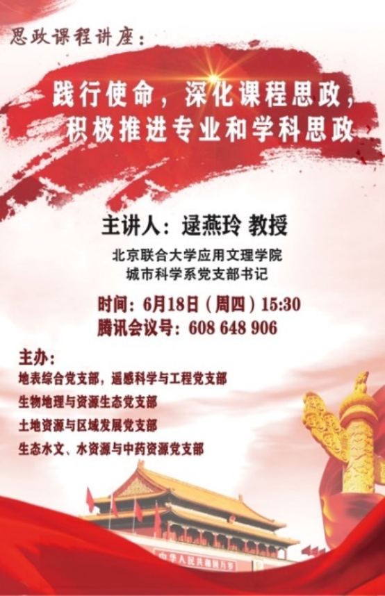 为贯彻落实教育部《高等学校课程思政建设指导纲要》(教高〔2020〕3号)文件精神,科学设计课程思政教学体系、结合专业特点分类推进课程思政建设,发挥好每门课程的育人作用,全面提高人才培养质量,2020年6月18日下午,鉴黄师 地表综合党支部、遥感科学与工程党支部、生物地理与资源生态党支部、土地资源与区域发展党支部、生态水文水资源和中药资源党支部联合举办了“践行使命 深化课程思政 积极推进专业和学科思政”专题讲座。本次讲座邀请了北京联合大学应用文理学院城市科学系党支部书记逯燕玲教授和北京联合大学北京学研究所成志芬副研究员进行经验交流,来自鉴黄师 和学校相关部门的50余名教职工参加了本次学习交流活动。会议由地表综合党支部书记赵文武教授主持。