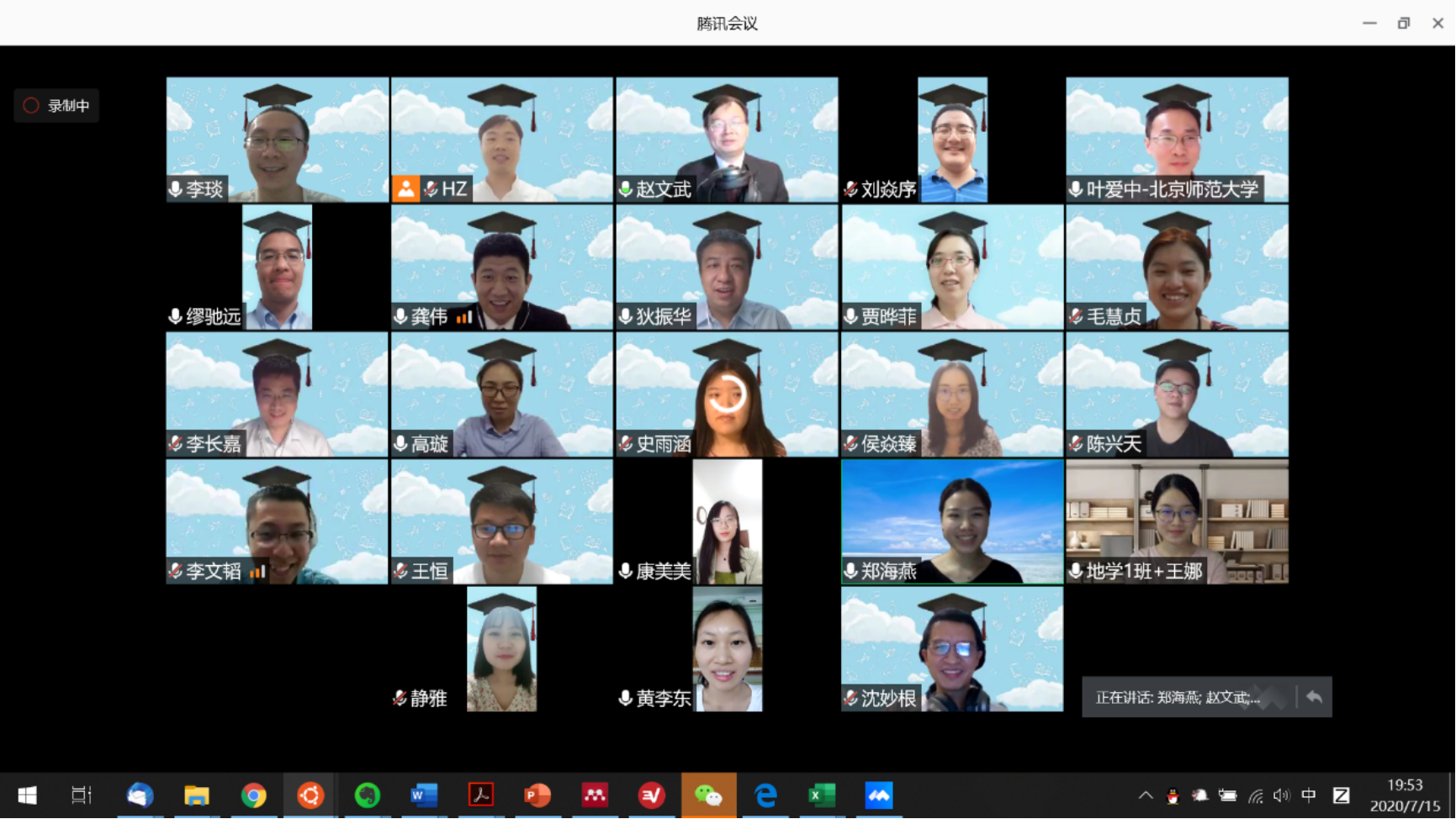 2020年7月15日,陆地表层系统科学与可持续发展研究院(简称陆发院)举行了2020年云端毕业生欢送会,会议由刘焱序老师主持。陆发院2020年有9名毕业生,其中博士5名,硕士4名。研究生就业去向主要为高校、科研单位、政府部门、企、事业单位。