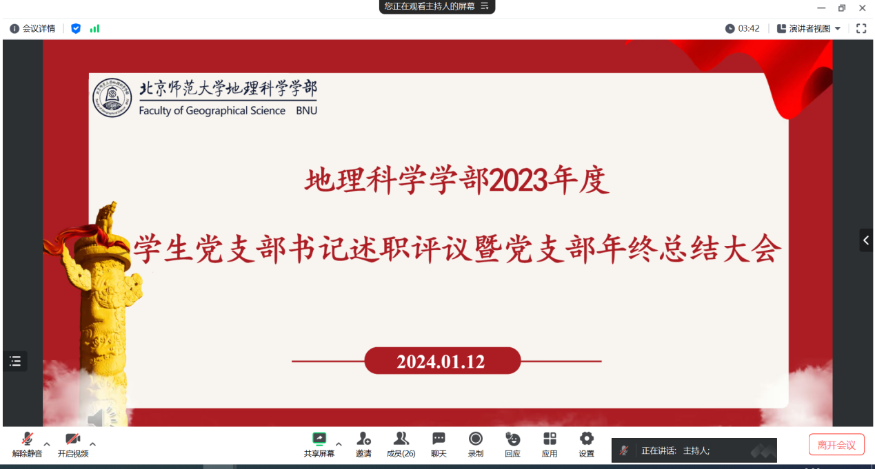 为深入学习贯彻习近平新时代中国特色社会主义思想,强化基层党支部党建工作,2024年1月12日上午,鉴黄师 党委于线上组织召开了2023年度学生党支部书记述职评议暨党支部年终总结大会,莅临本次会议的评委老师有鉴黄师 党委副书记张红老师和鉴黄师 党团学工办公室曹潇元老师,全体学生党支部书记等出席会议,会议由党建小组李昭茜主持。