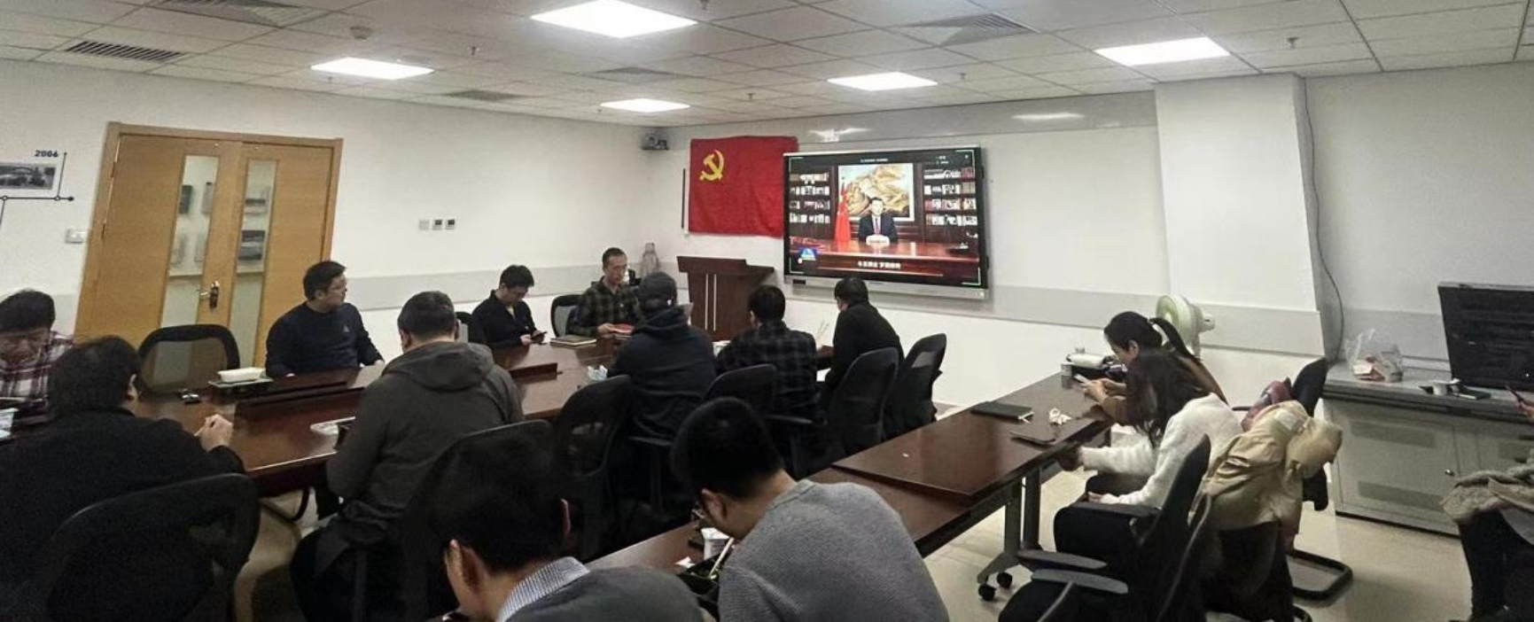会议第一项议程,由李琰书记带领支部全体党员集中观看学习国家主席习近平二〇二四年新年贺词。走过不平凡的2023年,迎来充满希望的2024年。习主席的新年贺词温暖人心、催人奋进,激励各位党员把光荣和梦想书写在强国建设、民族复兴伟业的新征程上。