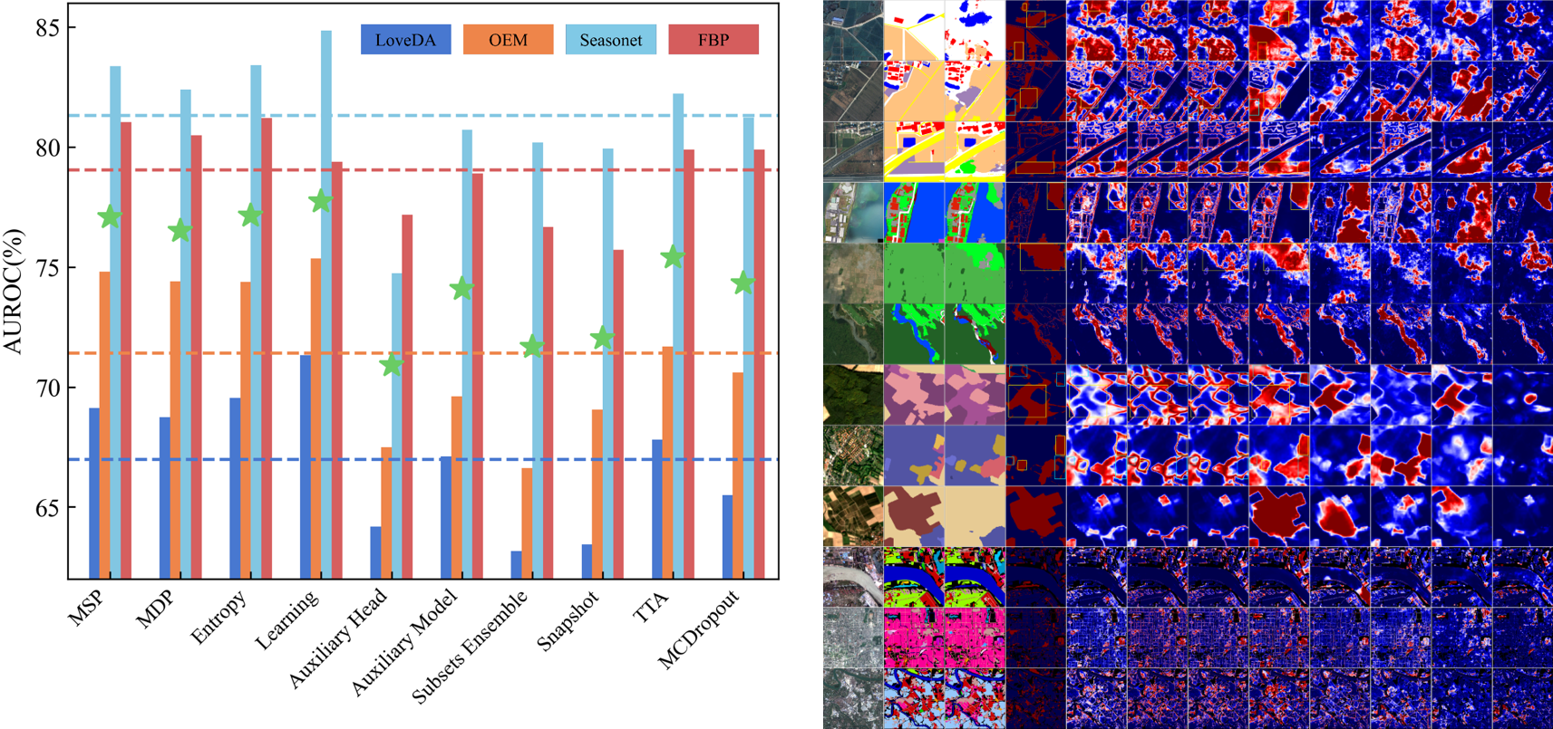 在实验对比部分,在同一框架下,基于相同的分割模型、数据集和评价方法,定量对比和评估了多种不确定性估计方法,解决了不确定性估计方法的适用性难以评估的问题。该研究的主要特色和贡献体现在其涉及的不确定性估计方法、数据集和评价方法的广泛性。具体来说,文章对比评估了10种不确定性估计方法在域偏移条件下土地覆盖分类任务中的性能(图5)。这10种不确定性估计方法包括3种基于概率分布的方法,1种基于学习的方法和6种基于预测一致性的方法。数据集方面,该研究考虑了制图中常见的4种域偏移类型,包括场景偏移、位置偏移、季节偏移和光谱偏移(图6)。一方面,该研究从有效检测、失效检测和总体性能三个方面对不确定性估计方法进行直接评价。另一方面,该研究通过比较下游任务在应用不同不确定性估计方法时的性能差异实现对不确定性估计方法的间接评价。研究发现:(1)许多不确定性估计方法对于有效检测或失效检测具有偏向性,例如Test Time Augmentation方法在有效检测任务上表现较好,在失效检测任务上表现一般,而Auxiliary Model方法则具有相反的表现。因此,在实际应用中需要结合下游任务的特点选择适当的不确定性估计方法。(2)基于概率分布的方法在大多数数据集和指标上具有较好的性能,同时具有较高的效率。但由于其overconfidence问题的存在,其在部分数据集的有效检测任务上表现相对较差,同时导致其在无监督域适应任务上性能较差。(3)基于学习的方法尽管尚未在遥感领域得到广泛的应用,但是其在绝大多数数据集的各项直接评价指标和间接评价中都展现出了较强的性能,值得进一步深入研究,充分发挥其应用潜力。