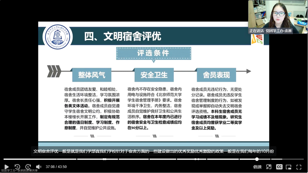 随后,余淅老师对学部文明宿舍评优进行了介绍,强调了宿舍整体风气、安全卫生以及舍员表现的重要性,鼓励大家踊跃报名。并对相关问题进行答疑,让同学们对宿舍建设有了更为清晰的认识。