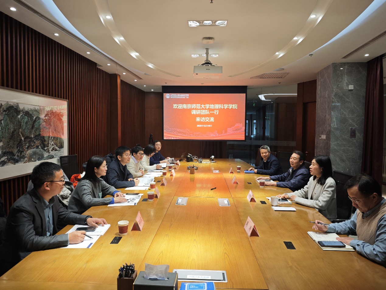 2025年12月15日下午,南京师范大学地理科学学院党委书记黄昌春,院长陈旻,副书记张玉清,副院长陈霞、李红波、乐松山一行6人到地理科学学部交流访问。地理科学学部部长李小雁,副部长周涛、蒋卫国,副书记陈蓉蓉代表学部接待。会议由李小雁部长主持。