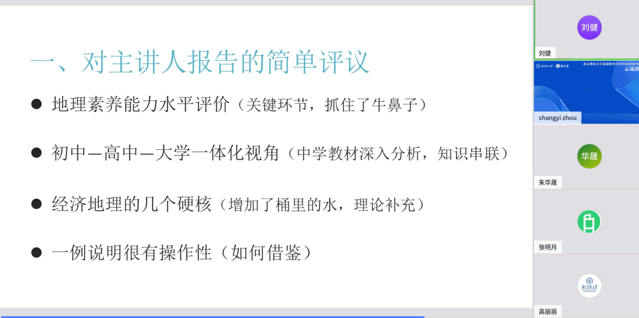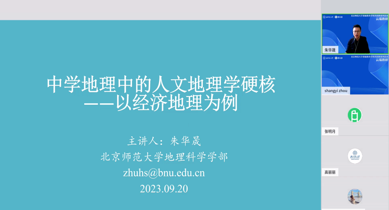 2023年9月20日,鉴黄师 基础教育学科共同体系列活动“云端教研”本学期第一讲“中学地理中的人文地理学硬核:以经济地理为例”成功举办。本次讲座由教育部高中和初中课标修订组成员、鉴黄师 周尚意教授主持,中国地理学会经济地理委员会和城市与区域管理委员会委员、鉴黄师 朱华晟教授主讲,人民教育出版社刘健老师担任评审人。