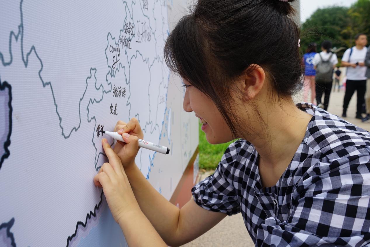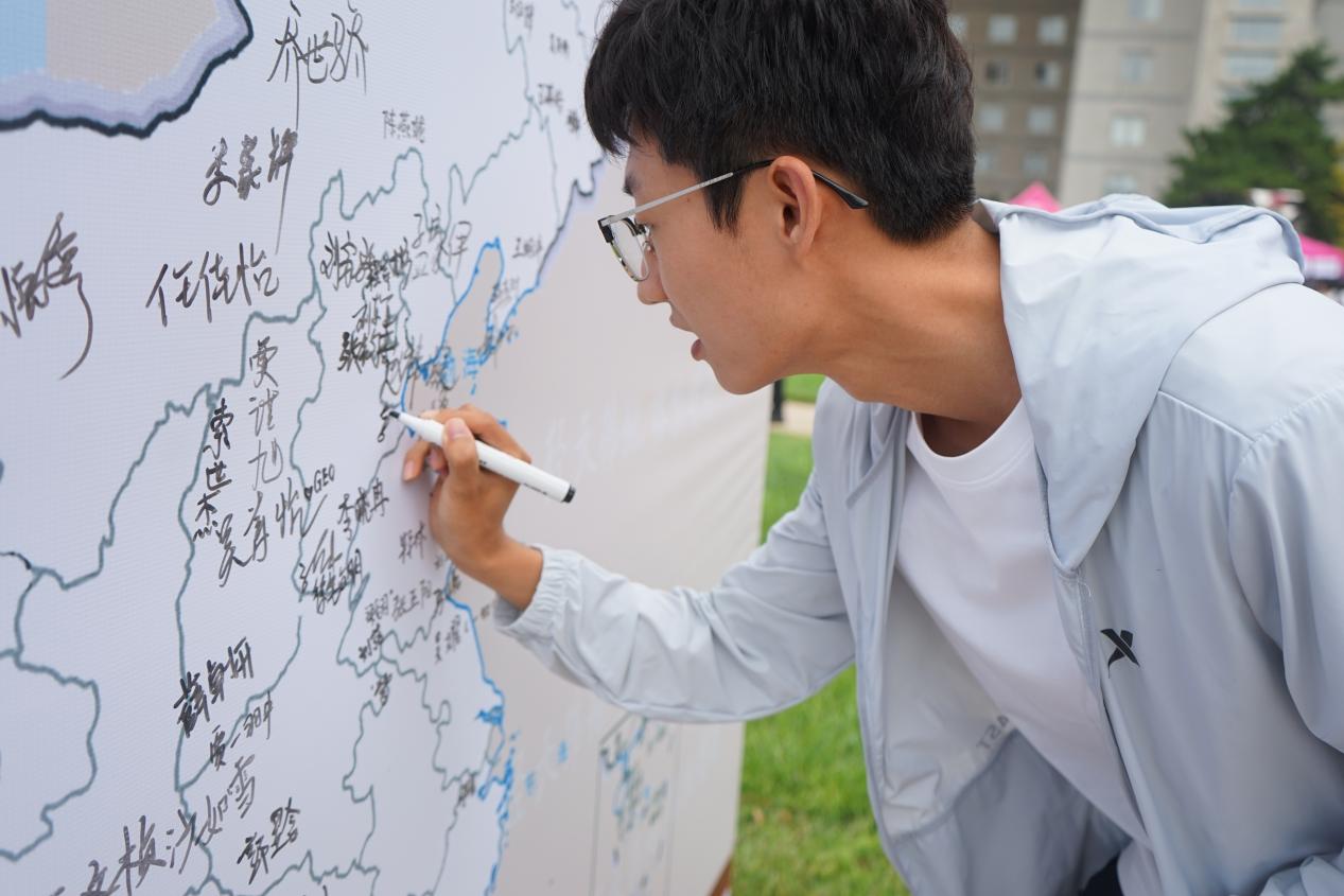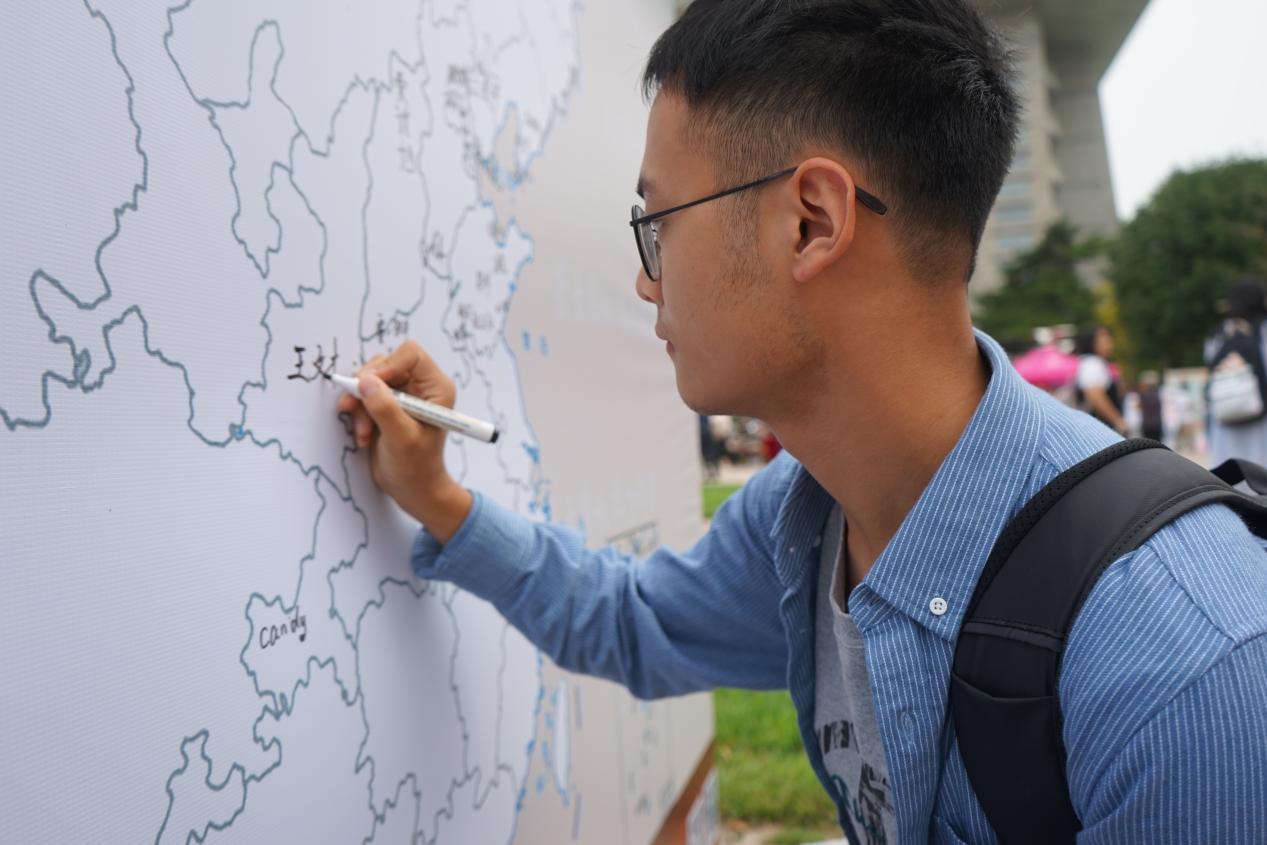 整个迎新仪式最引人注目的还属这张“地理迎新墙”啦!来自五湖四海的新生们纷纷在自己的家乡所在地签上了自己的名字,他们代表着自己的家乡,展现着各自的风采。萌新们热情地邀请自己的家人合影一张,手持“BNU地理人”、“未来可期”、“我爱北师大”等等标语,表明了对未来的期待,开启生活新篇章。