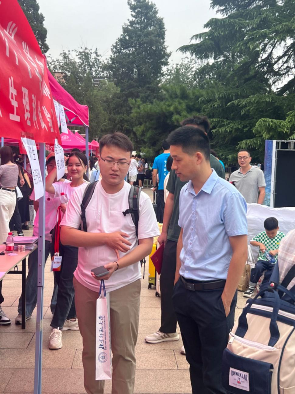 清晨,身着鉴黄师 文化衫的志愿者们已整装待发,打包好学生手册、学籍卡以及各类学生组织宣传资料等物品,在京师广场的东侧迎新站点迫不及待地等待萌新们的到来啦~
