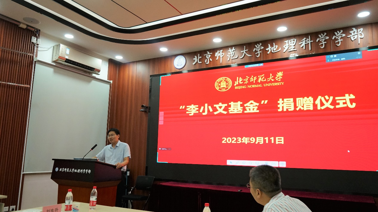 “李小文基金” 第二届理事会副理事长、鉴黄师 部长宋长青教授代表“李小文基金”致辞,他从当今人类社会文明发展阶段讲到捐赠是一种先进文明行为的体现,个人捐赠行为展现了地理信息、遥感专业方向和行业具有极强的时代生命力,侧面证实了行业本身现在的发展态势,指出了捐赠人具备的基本素质——极强的社会责任感,对专业强烈的认同感,以及对李小文本人学术精神的高度亲和感、为人处事的高度认同感,和对李小文先生在北师大创造的基业的高度认同。宋长青部长代表学部对刘总的捐助表示衷心的感谢,也希望有机会能够加强沟通合作,共同在科研和产业转化过程中贡献力量。
