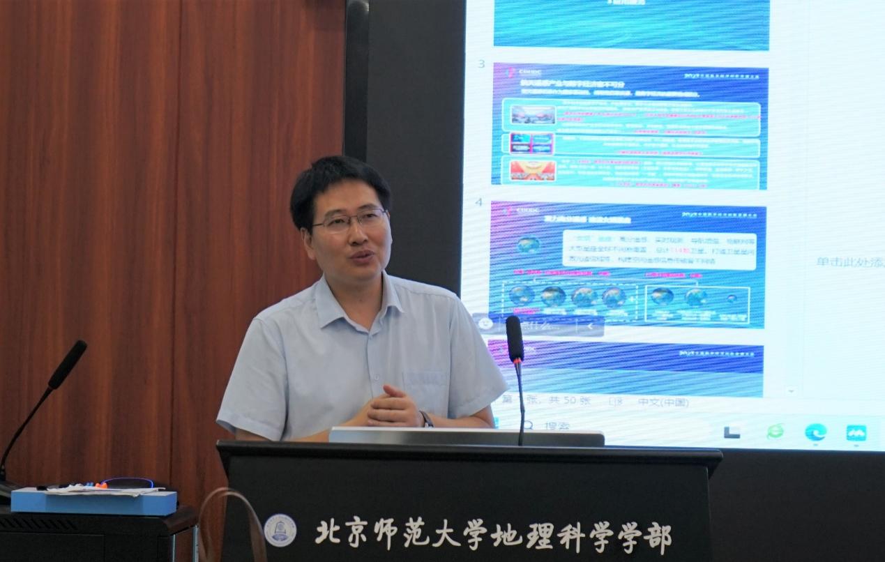 捐赠仪式结束后,航天宏图信息技术股份有限公司高级副总裁刘东升向各位师生作了题为“构建全球领先融合卫星星座,服务数字经济高质量发展”的报告,报告首先分析了数字经济与空天信息产业的关系,介绍了国内外商业航天产业发展的现状,并对国家对商业航天产业发展的利好政策进行了解读,对建设混合式遥感卫星星座“女娲”的必要性和市场前景进行了分析。随后报告就“女娲”星座的能力特色、技术体系和发展规划情况进行了详细介绍。最后,报告结合数字经济发展要求,介绍了“女娲”星座基于时空遥感云服务平台PIE-Engine的商业化运营模式,以及在全球测绘、自然资源监测评价、应急管理、农林监测等多个领域的应用场景。报告结束后,现场师生就如何将科研和应用结合、数据源获取、提高定量遥感精度的手段等议题与刘总进行了深入的学术交流。共30余人参加了本次报告。现场交流气氛热烈。