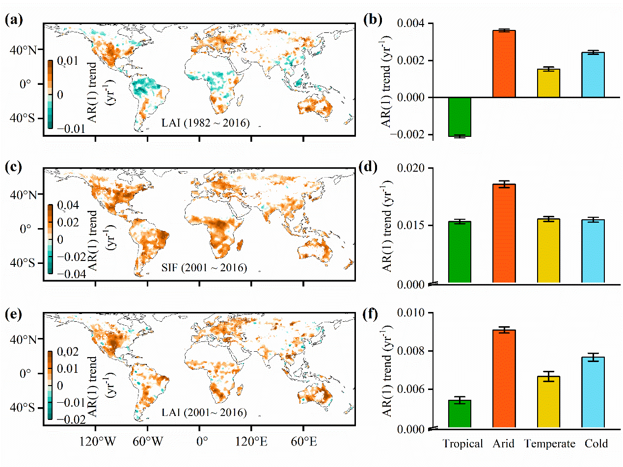 生态系统恢复力是维持生态系统结构和功能稳定的基础。然而,全球过去几十年生态系统恢复力变化的阶段性,以及在未来气候变化下生态系统恢复力丧失的风险尚不清楚。基于时间自相关原理的AR(1)指数是评估生态系统恢复力的常用指标。本研究首先基于叶面积指数(LAI)和太阳诱导叶绿素荧光(SIF)评估了生态系统AR(1)的空间格局。然后应用趋势分析和断点分析识别了恢复力的变化,并分析了这种变化的驱动因素。最后利用CMIP6的总初级生产力(GPP)数据预测未来生态系统恢复力丧失的风险。研究主要发现如下: