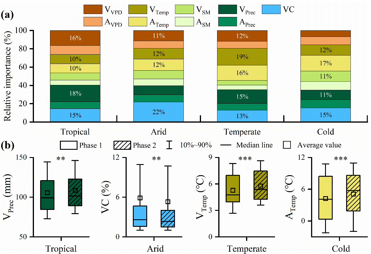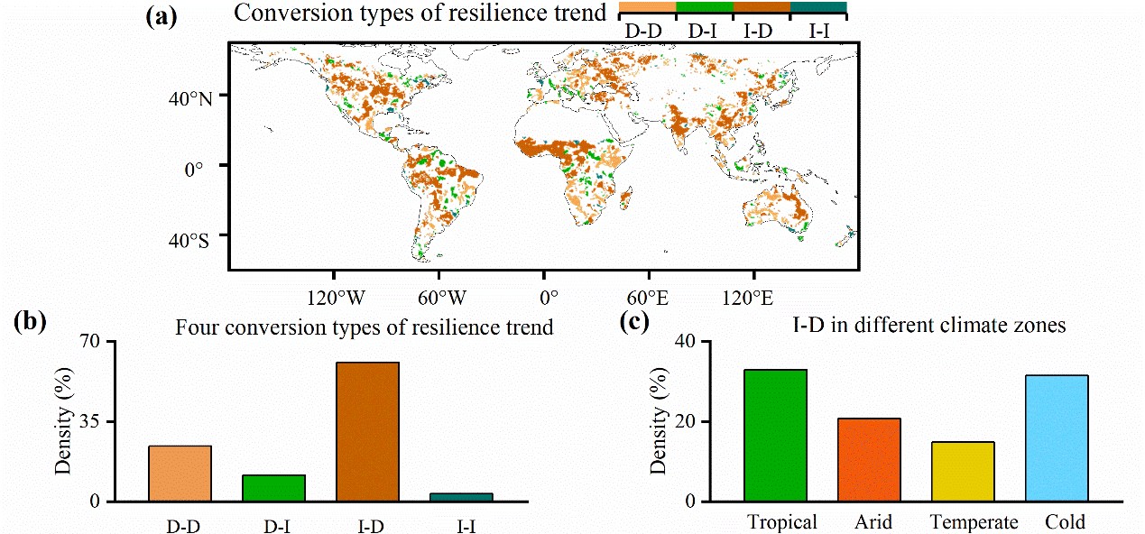 恢复力变化的关键驱动因素存在空间差异,热带的降水变异性变化、干旱区的植被覆盖度变化、温带和寒带的气温变化解释了恢复力从第1阶段的增加趋势到第2阶段的下降趋势的转变。