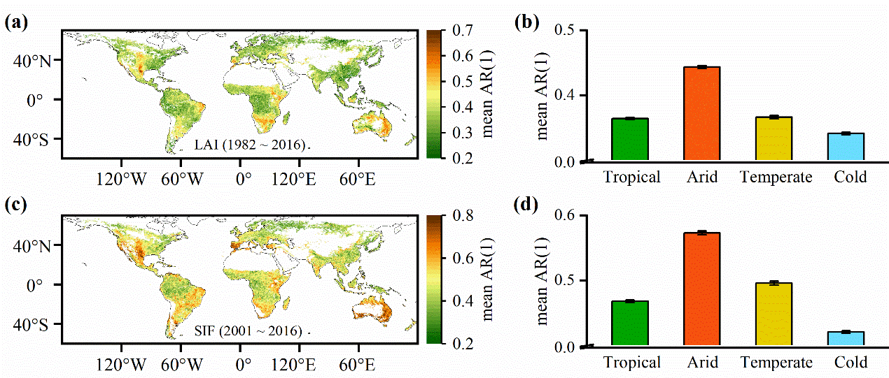 LAI和SIF一致地揭示了高值AR(1)集中在北美洲西南部、南美洲东部和南部、非洲南部、地中海和澳大利亚(图1a,c);低值AR(1)集中在欧亚大陆北部、亚马逊地区、刚果地区和东南亚。就不同气候区而言,AR(1)平均值在干旱区最高(图1b、d),示意干旱区生态系统最低的恢复力。
