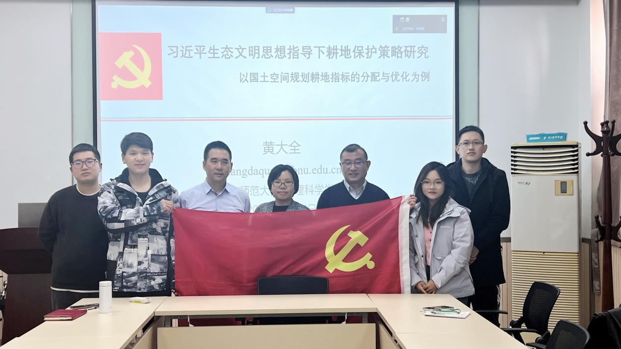 本次党课以习近平生态文明思想为指导,围绕生态文明建设、耕地保护重大战略需求与新时代地理学的关系,以国土空间规划耕地指标的分配与优化为例,从地理视角阐述生态文明背景下耕地保护策略。黄大全教授的党课报告结合近年开展的研究工作,从引言、分析框架、研究区域、数据和方法、研究结果和讨论与结论五个部分依次展开。报告中,黄大全教授强调耕地保护事关国家粮食安全,探讨了不同资源禀赋、粮食产销功能分区耕地保有量指标空间分配格局和分配策略的差异性,以及多政府层级在耕地保护指标分配的作用和影响因素,分析了指标分配策略的合理性和指标失效的原因。这些宝贵的研究结果,有助于完善国土空间规划耕地指标分配实施与管理,保障我国耕地资源的数量和质量。