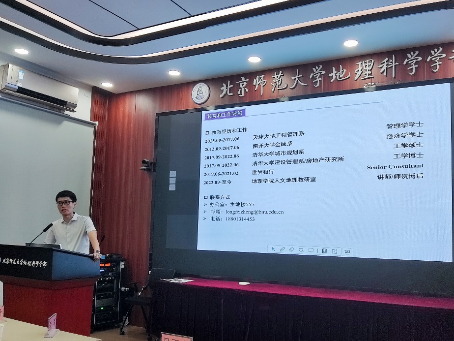 然后,四位新老师进行自我介绍。王雪松老师从基本信息、研究方向、自我评价三个方面进行自我介绍,并表示在今后工作学习中会努力的优秀的完成学校、学部和学院布置的教学科研任务,积极参与和全力支持学院的各项工作。郑龙飞老师从教育和工作背景、研究方向两个方面进行自我介绍。毛婷老师从基本信息、学历背景和研究方向三个方面进行自我介绍,并分享了自己在四年学生工作中的经历、感受和收获,最后毛婷老师表示未来的工作重心将从第二课堂转移回第一课堂。Gary老师表示很荣幸加入地理学院这个集体,并感谢大家对他的包容,此外Gary老师表示深受荣休仪式的感动与鼓舞。
