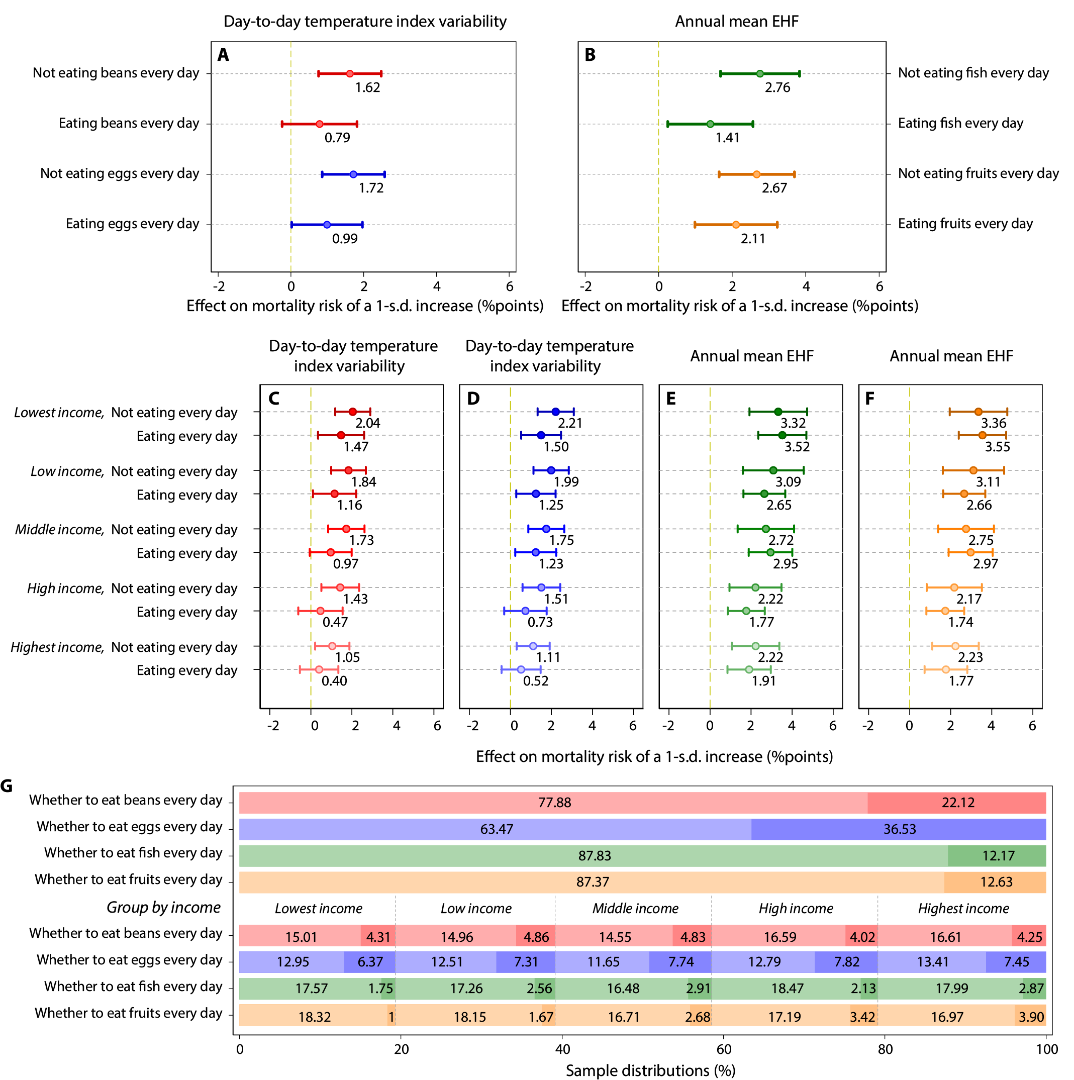 作者还分析了老年人个体特征、社会经济状况及饮食习惯的异质性影响,揭示了气温变化背景下易受影响的脆弱人群。其中,饮食习惯在气温变化对死亡风险的影响中起到了调节作用,某些特定的饮食习惯能够缓冲气候变化的影响,从而有助于降低气温变化对死亡风险的负面影响(图3)。