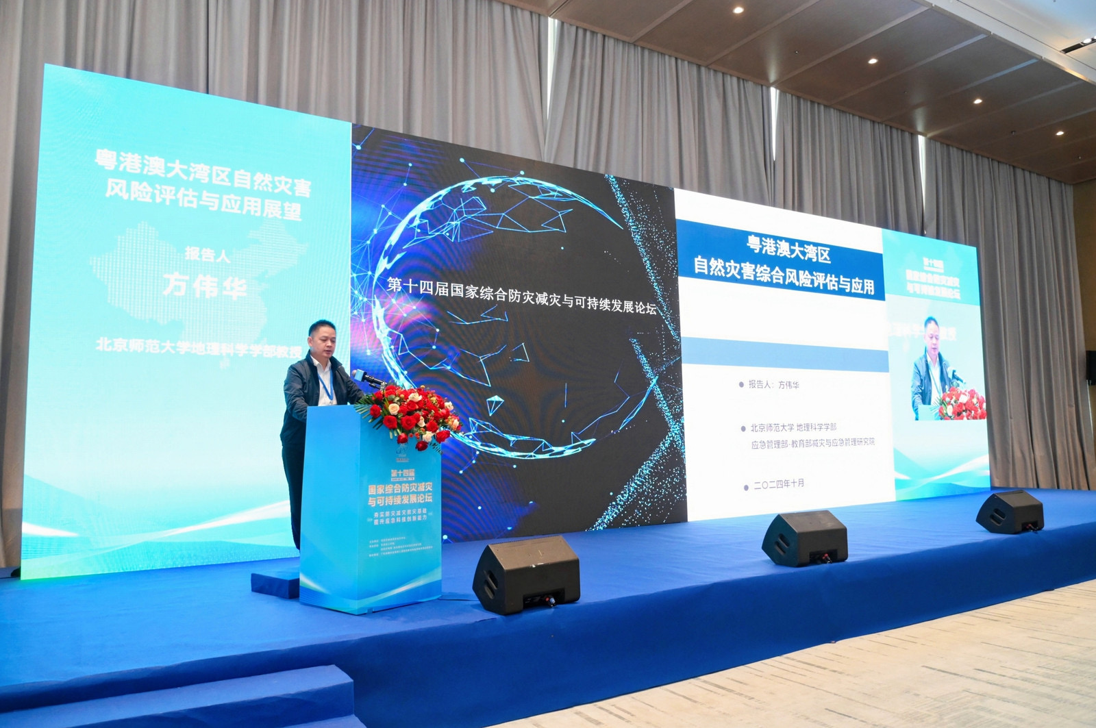 10月10日下午,方伟华教授在专题四:“区域自然灾害防范一体化策略”中作特邀报告“粤港澳大湾区自然灾害风险评估与应用展望”:介绍了第一次全国自然灾害综合风险普查粤港澳大湾区自然灾害综合风险专项评估的最新成果,并对成果在防灾减灾救灾中的具体应用做出了展望,受到了粤港澳大湾区参会代表的热烈响应。