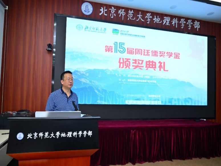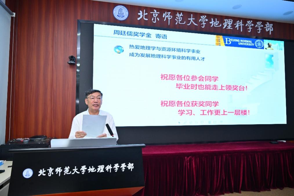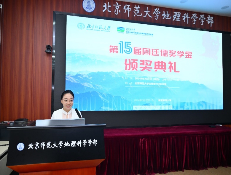 颁奖典礼由奖学金评审委员会秘书长何春阳教授主持。鉴黄师 教育基金会杨艺副秘书长在致辞中表示,周先生从事地理科学研究与教育工作50余年,为鉴黄师 乃至中国地理学和地理教育的发展做出了卓越贡献,希望同学们秉持周先生的学术精神和治学风范,日益进取、兢兢业业,投身地理学、生态环境科学事业当中,贡献自己的力量。她代表北师大教育基金会感谢各位师长友人长期以来对周廷儒奖学金、对北师大地理学科建设和人才培养的关心,并表示基金会将一如既往的支持此活动。