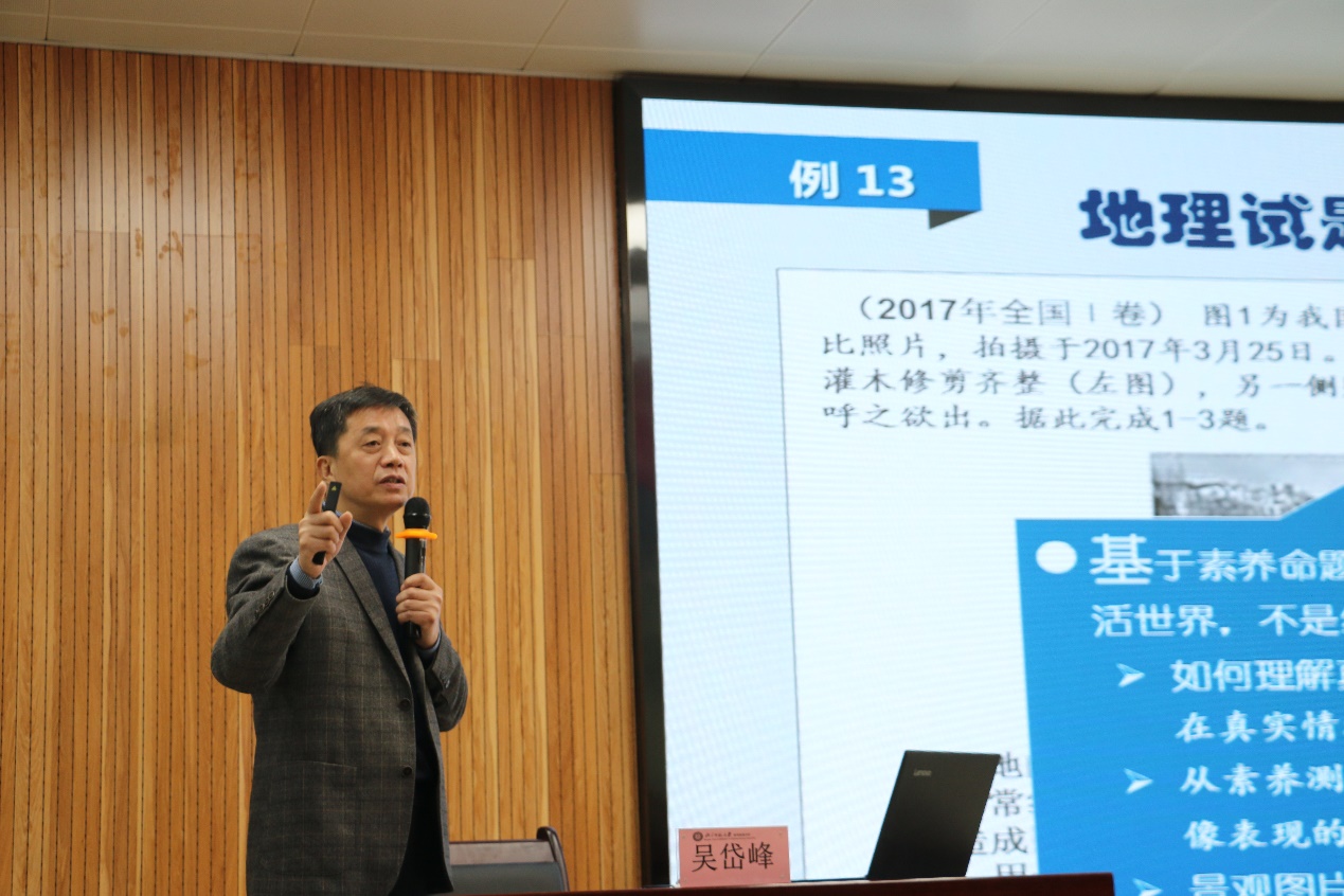 蚌埠市教育科学研究所地理教研员、正高级教师吴岱峰老师作了题为“基于地理核心素养评价命题的实践与思考——测试命题:从经验走向科学”的主题讲座,吴老师从近20年初中高中地理学科考试命题的现象及规律出发,帮助教师认识地理命题并把握新课标下地理教师专业发展的有效路径。