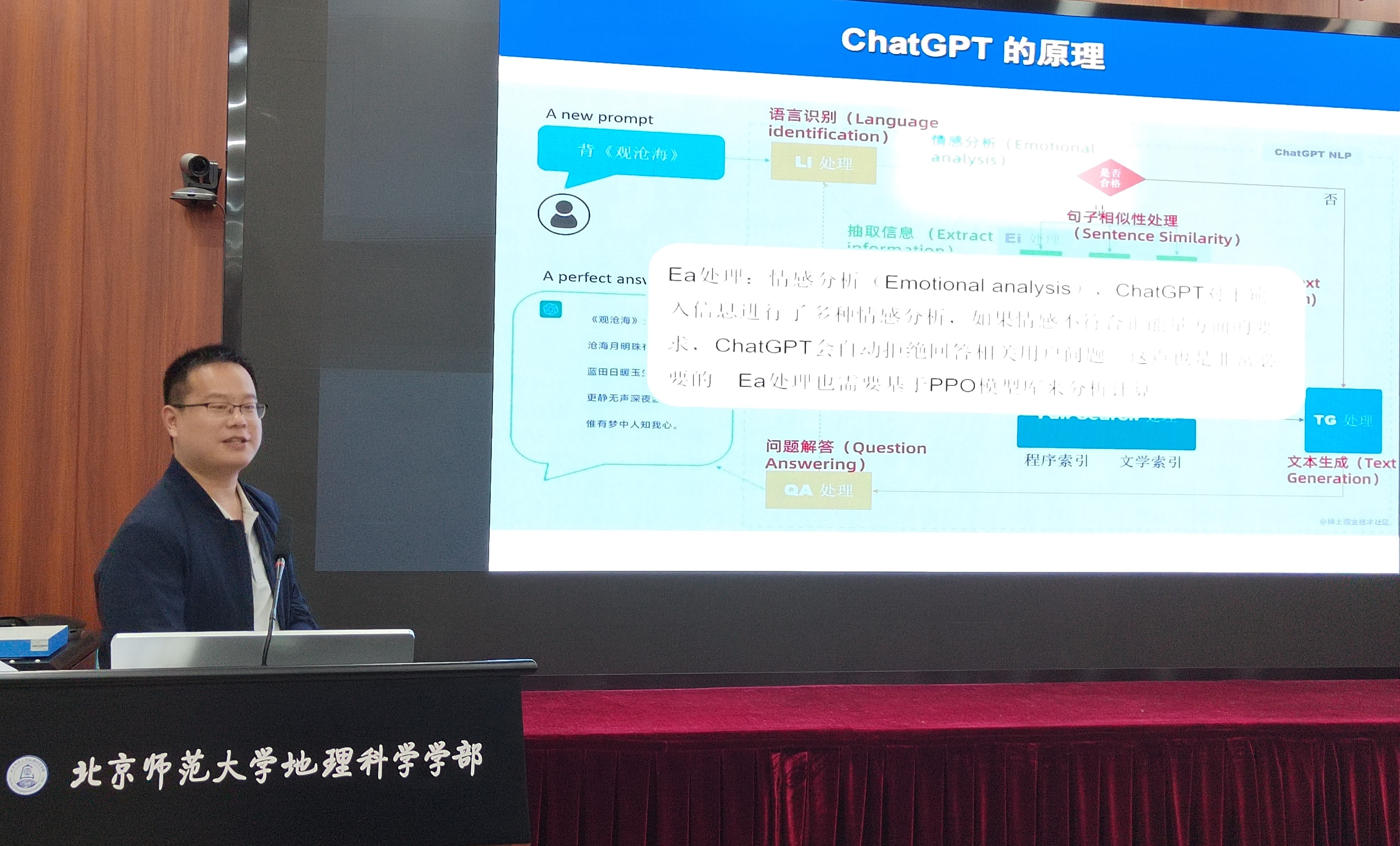 唐宏教授作为特邀嘉宾分享了个人思考心得。他谈到,当下人工智能在计算机视觉、语言建模等领域的模拟行为已经飞速发展,未来物理模型和机器学习模型走向融合的可能性是极大的。人工智能带来的便利和压力是同时存在的,一是对老师提出了更高的教学要求,需要重点思考如何引导学生、如何提升学习效果和能力。二是对学习内容的革新,是否将机器学习为代表的新兴知识作为基础必修课是值得探讨的话题。同时,唐老师对地理学和信息学的融合以及地理研究在人工智能领域发挥重要作用提出了展望。他表示,目前人工智能的海量信息来源并未关注数据所在的地理环境,而算法涵盖具体的时空概念才能真正走向现实世界。