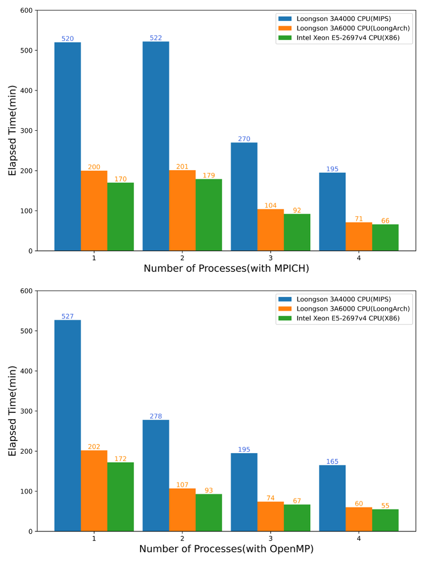 这一工作始于2009年,团队成员基于MIPS架构的龙芯2F芯片平台实现了中尺度气象模式MM5的应用,并在后续工作中实现了中尺度气象模式在四个CPU核心的龙芯3A平台的并行计算。在此基础上,团队基于公开渠道采购的MIPS架构的龙芯3A4000LoongArch 架构3A6000芯片平台开展气象和大气污染模式的适配和应用测试工作,进一步研发了适用于MIPSLoongArch等精简指令集计算(RISC)架构污染模式,实现了气象和污染模式在龙芯平台稳定运行,与主流通用计算平台结果差异控制在合理范围内。调用相同处理器数量的污染模式模拟案例测试结果表明,采用自主指令集LoongArch架构的龙芯3A6000计算效率比采用MIPS架构的龙芯3A4000提升了2.50~2.75倍,在龙芯3A4000平台满负载情况下,污染模式模拟24小时需要195min在龙芯3A6000平台仅需71min约等于该模式案例在英特尔至强处理器E5-2697 v4调用相同数量CPU核心的计算耗时,表明国产芯片单核计算性能取得了明显进步。