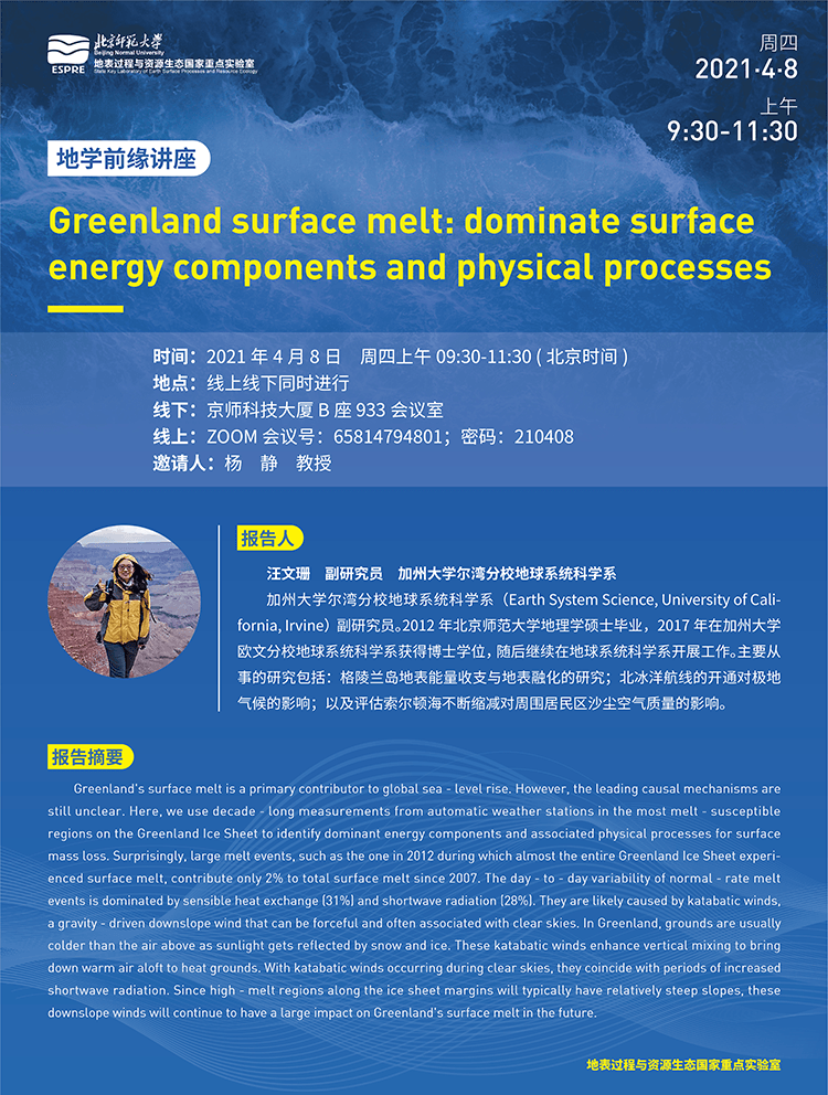 【2021年4月8日】汪文珊:Greenland surface melt: dominate surface energy components and physical processes