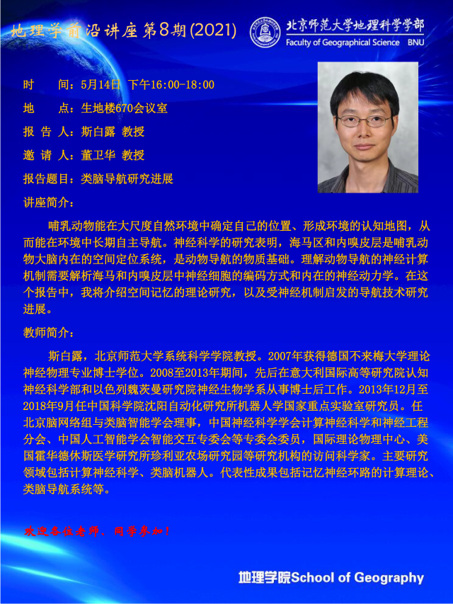 【5月14日讲座】地理学前沿讲座第8期(2021)斯白露:类脑导航研究进展