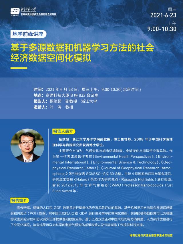 【6月23日讲座】地学前缘讲座,杨续超:基于多源数据和机器学习方法的社会经济数据空间化模拟