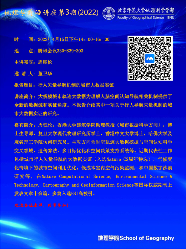 【4月15日讲座】地理学前沿讲座第3期(2022)周钰伦:行人矢量导航机制的城市大数据实证