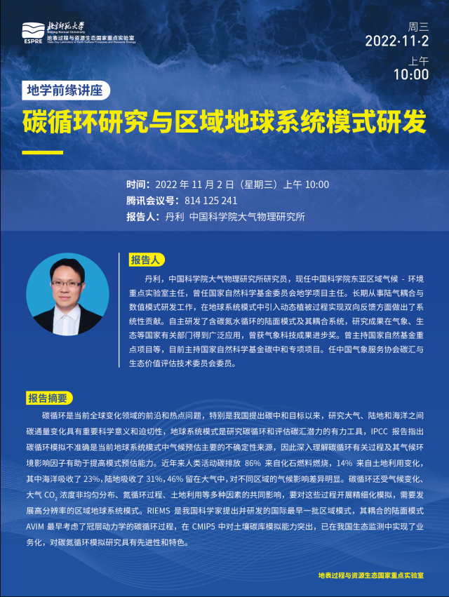 【11月2日讲座】丹利,碳循环研究与区域地球系统模式研发