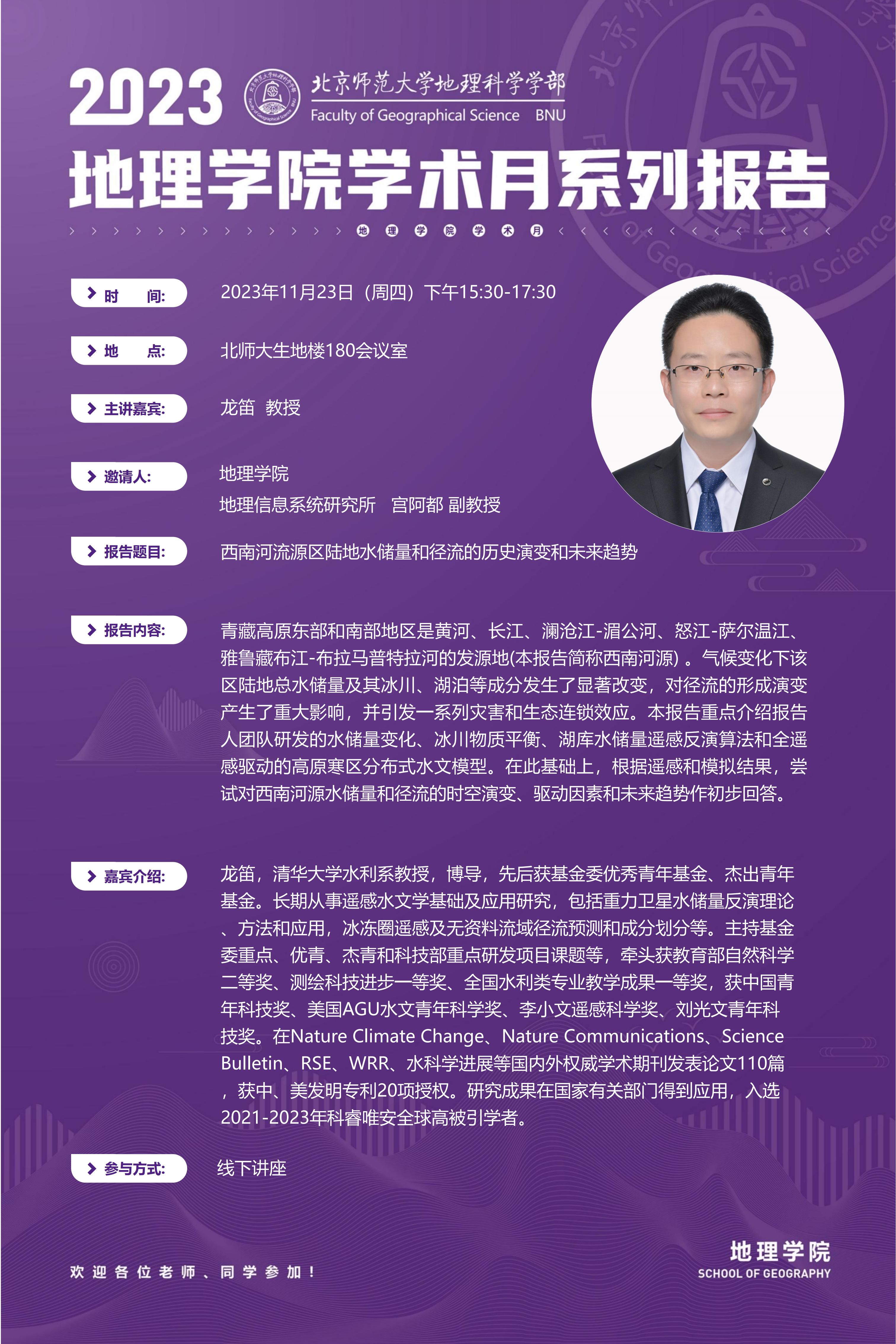 【11月23日】龙笛 教授,西南河流源区陆地水储量和径流的历史演变和未来趋势