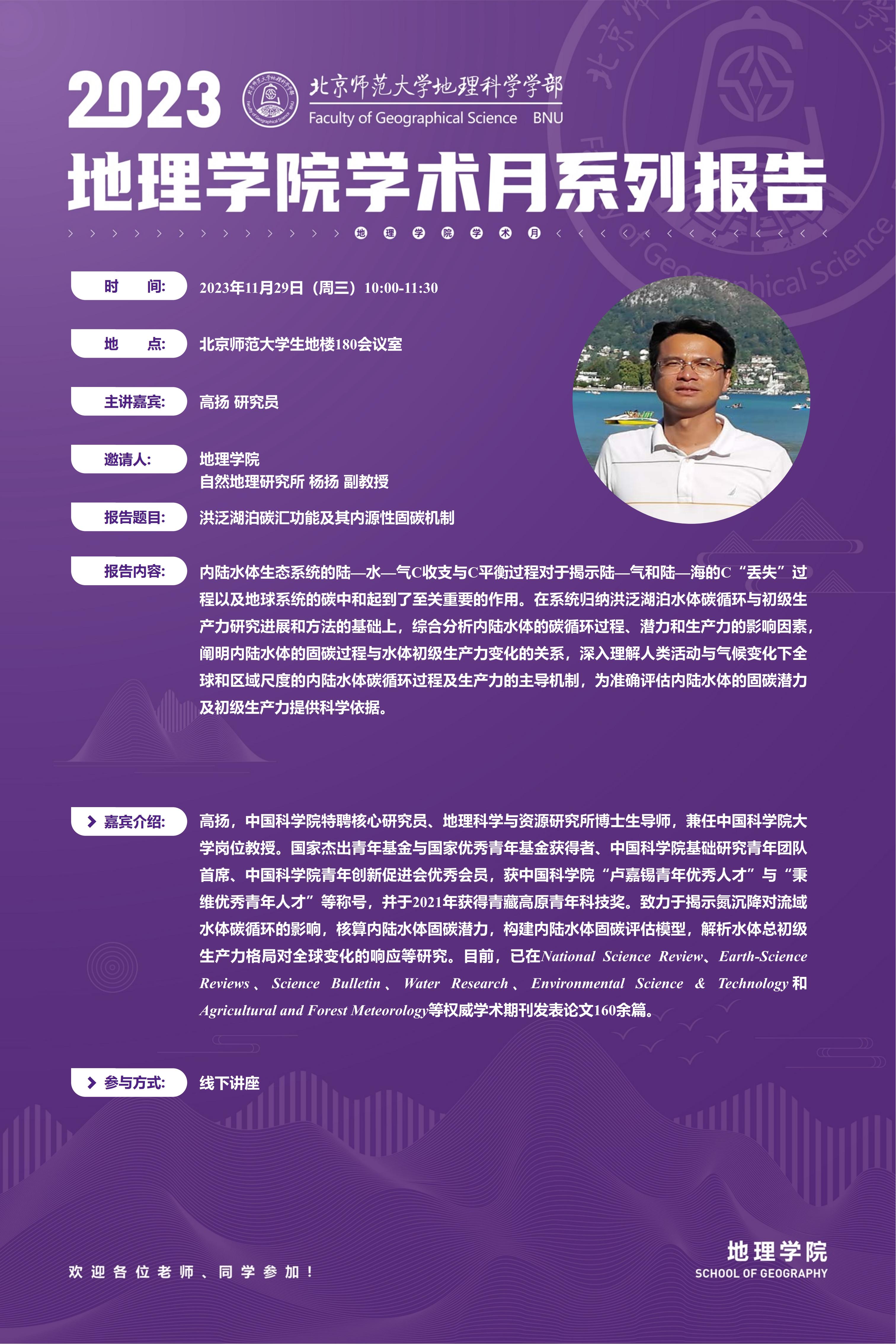 【11月29日】高扬 研究员,洪泛湖泊碳汇功能及其内源性固碳机制