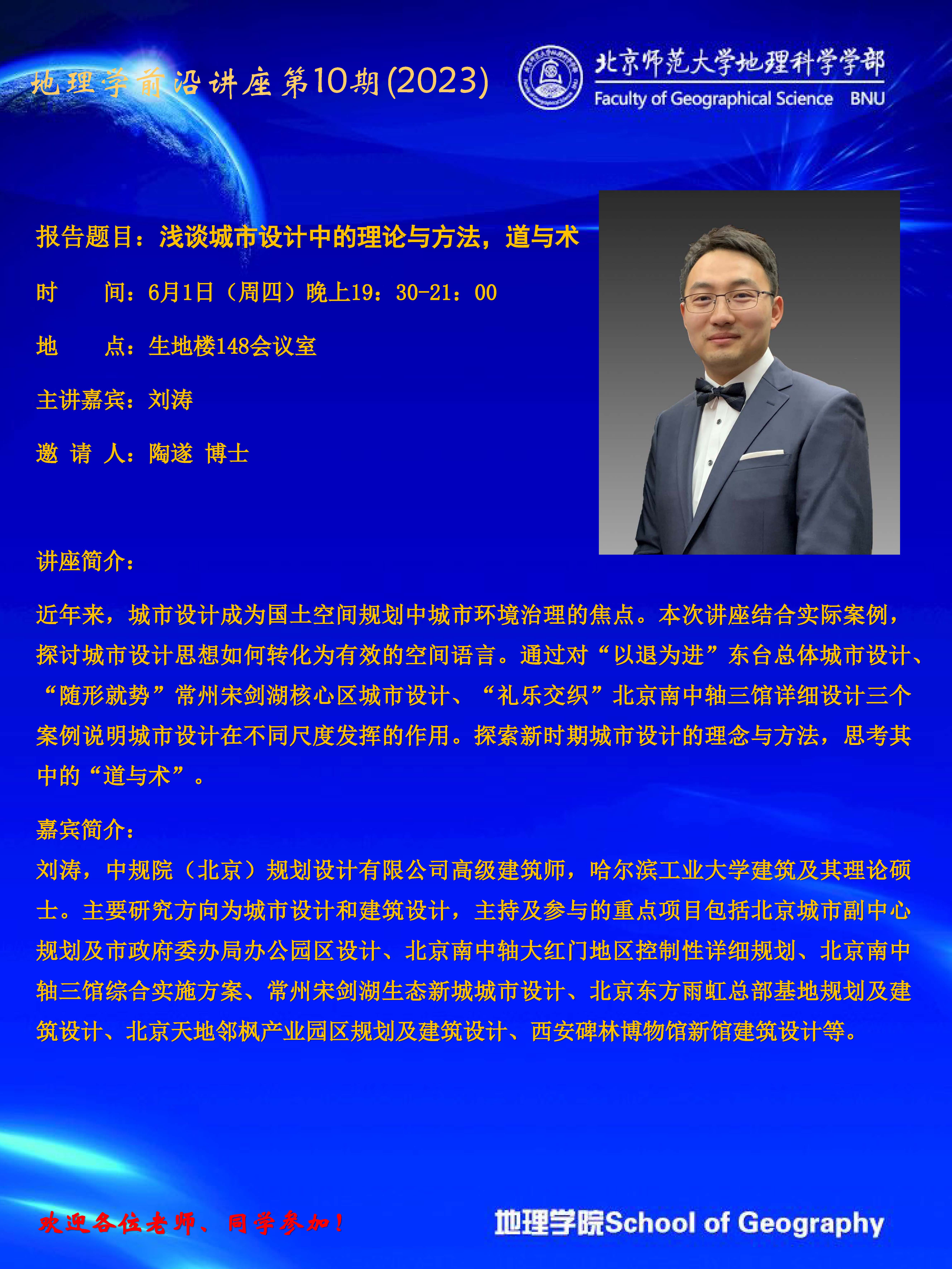 【6月1日】地理学前沿讲座第10期(2023)刘涛:浅谈城市设计中的理论与方法,道与术