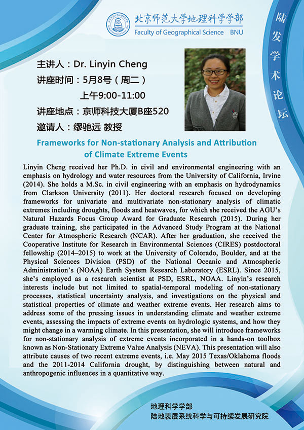 【5月8日讲座】Linyin Cheng,Frameworks for Non-stationary Analysis and Attribution of Climate Extreme Events