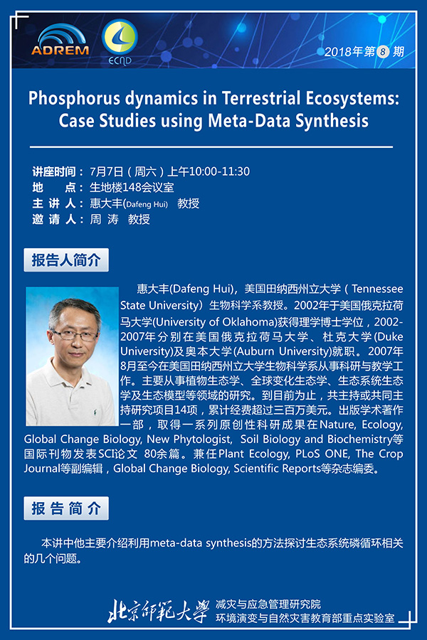 【7月7日讲座】惠大丰:Phosphorus dynamics in Terrestrial Ecosystems: Case Studies using Meta-Data Synthesis
