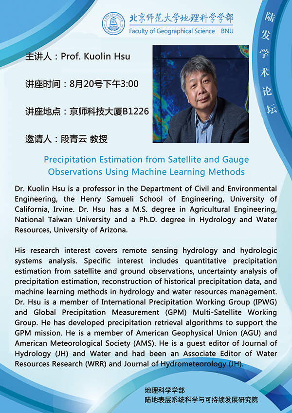 【8月20日讲座】Kuolin Hsu:Precipitation Estimation from Satellite and Gauge Observations Using Machine Learning Methods