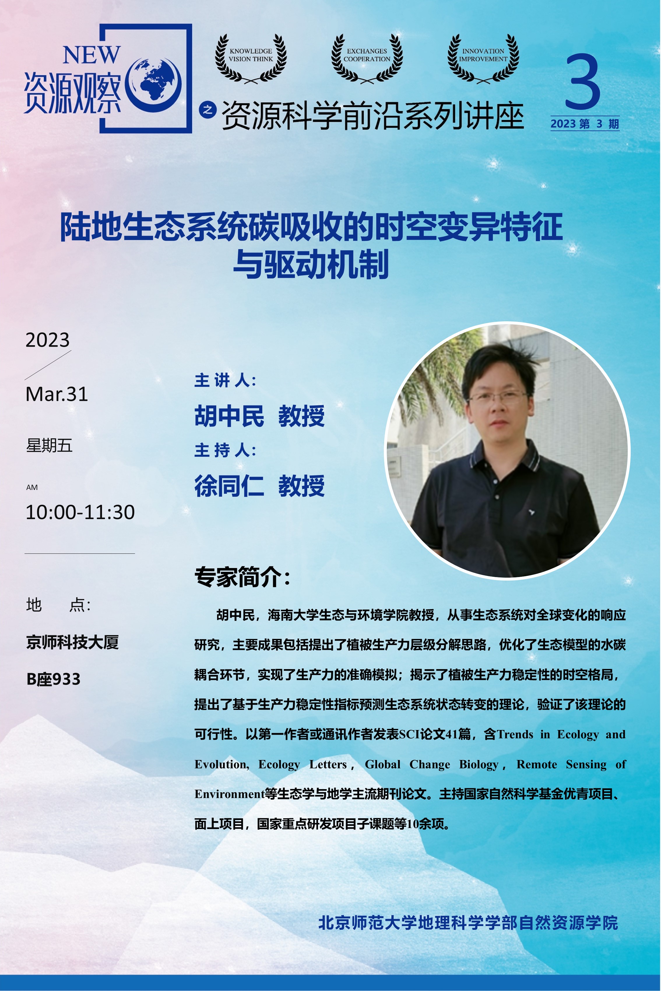 【3月31日】胡中民 教授:陆地生态系统碳吸收的时空变异特征与驱动机制