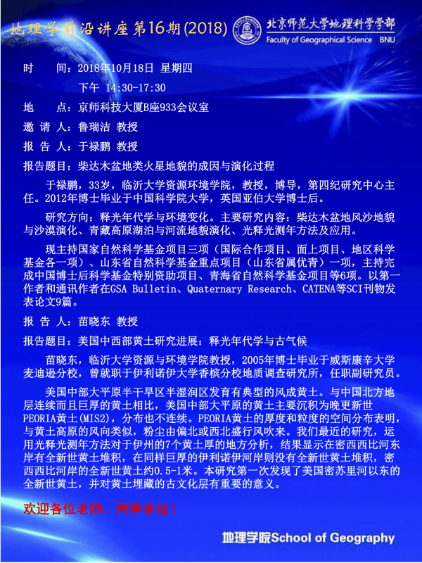【10月18日讲座】苗晓东:美国中西部黄土研究进展:释光年代学与古气候