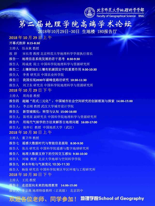【10月29--30日】第二届地理学院高端学术论坛