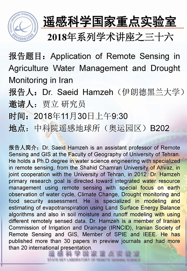 【11月30日讲座】Dr. Saeid Hamzeh,Application of Remote Sensing in Agriculture Water Management and Drought Monitoring in Iran