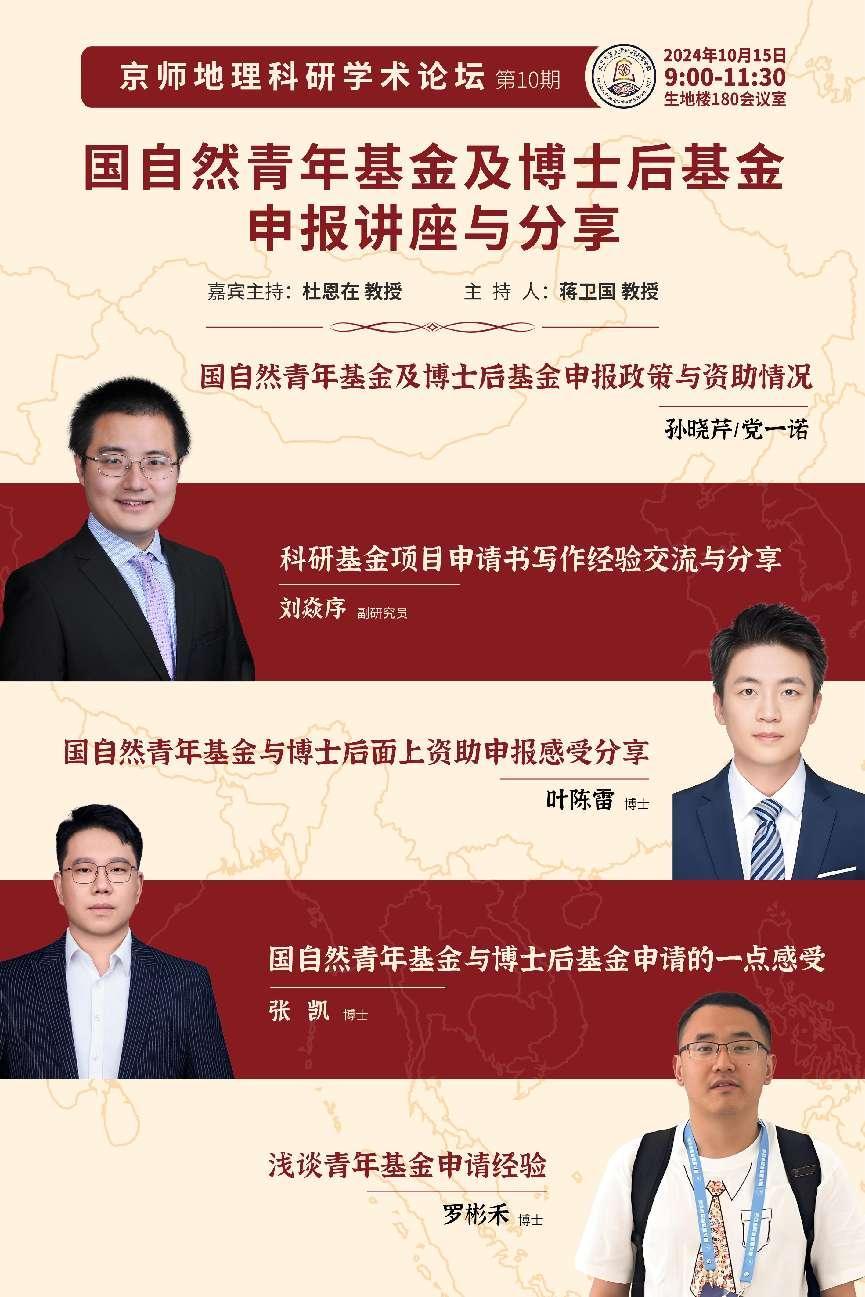 2024年10月15日(周二)上午9:00,京师地理科研学术论坛第10期之“国自然青年基金及博士后基金申报讲座与分享”将在鉴黄师 生地楼180会议室举行。