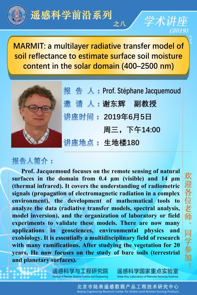 【6月5日讲座】Prof. Stéphane Jacquemoud,MARMIT: a multilayer radiative transfer model of soil reflectance to estimate surface soil moisture content in the solar domain (400–2500 nm)