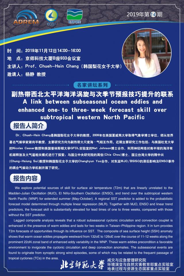 【11月12日讲座】张钰欣,副热带西北太平洋海洋涡旋与次季节预报技巧提升的联系