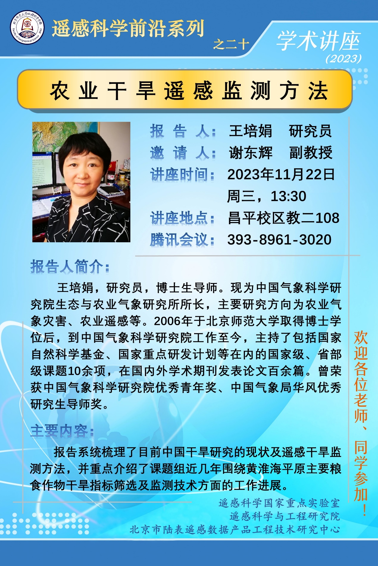 【11月22日】王培娟 研究员,农业干旱遥感监测方法