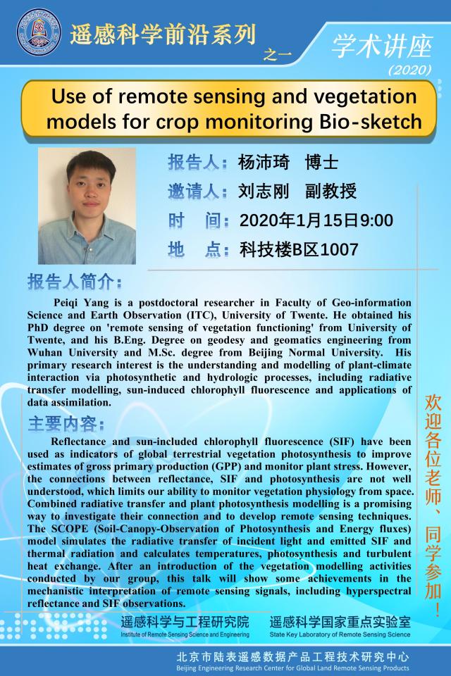 【1月15日讲座】杨沛琦,Use of remote sensing and vegetation models for crop monitoring Bio-sketch