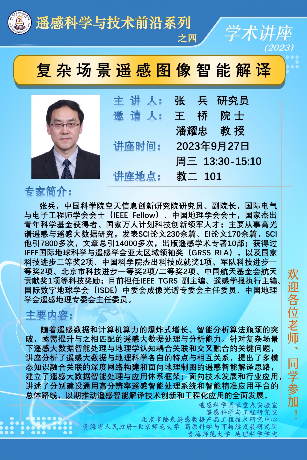 【9月27日】张兵 研究员,复杂场景遥感图像智能解译