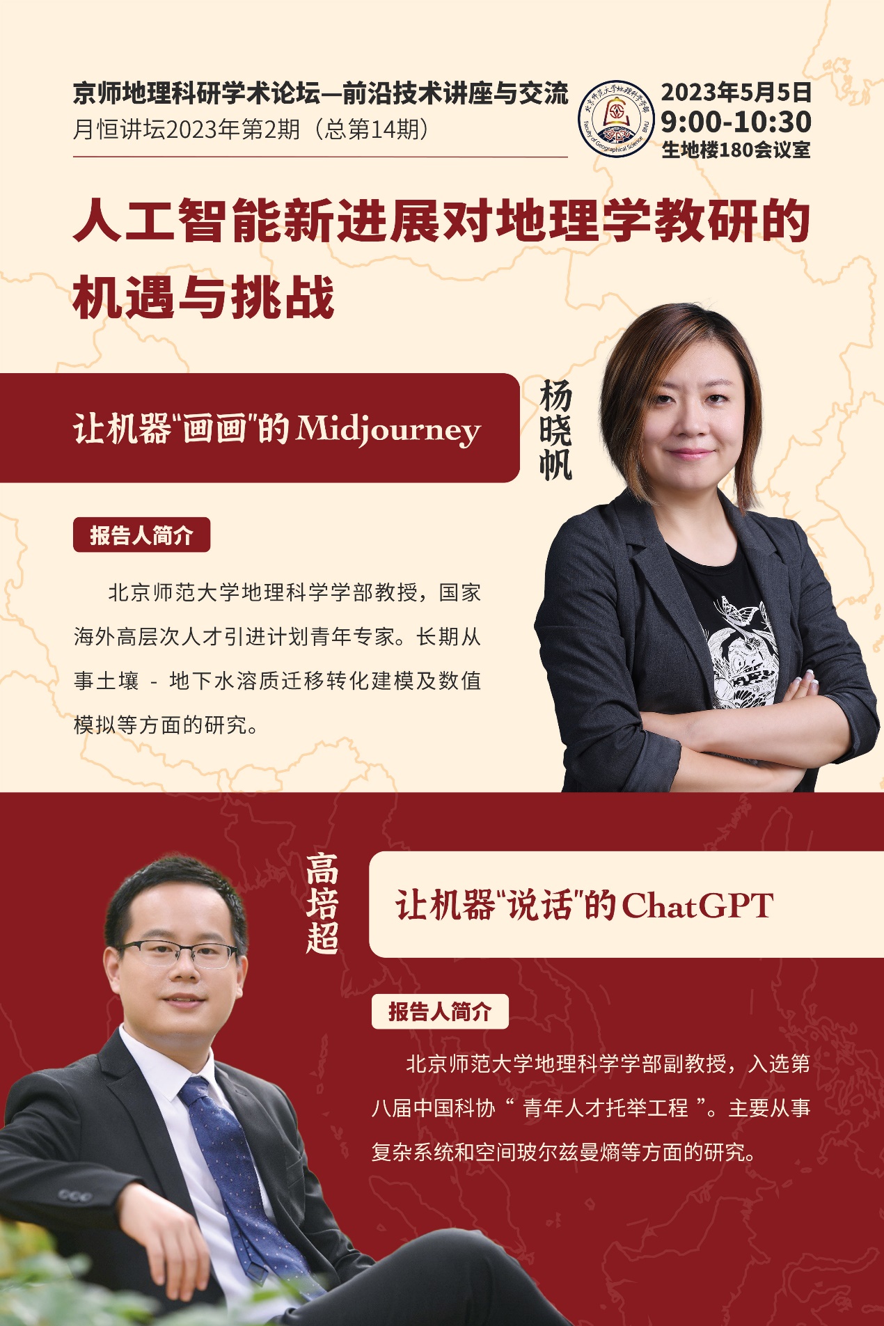 2023年5月5日(周五)上午9:00-10:30,“京师地理科研学术论坛—前沿技术讲座与交流”暨“月恒讲坛”第十四期将在鉴黄师 生地楼180会议室举行。本期邀请杨晓帆教授、高培超副教授,以“人工智能新进展对地理学教研的机遇与挑战”为主题进行报告与交流。